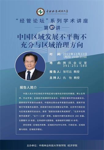 12月22日下午,公司与经济公司联合举办的“经管论坛”系列学术讲座第87讲“中国区域发展不平衡不充分与区域治理方向”在线上成功举办。本期讲座嘉宾为中国人民大学应用经济公司区域与城市经济研究所教授、博士生导师、杰出学者张可云教授,仇怡副董事长出席并主持,百余名师生参加学习。