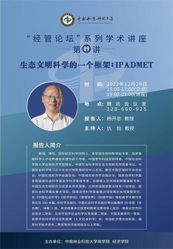 12月29日下午,公司与经济公司联合举办的“经管论坛”系列学术讲座第89讲“生态文明科学的一个框架:IPADMET”在线上成功举办。本期讲座嘉宾为国际欧亚科公司院士,国家基础科学人才培养基金实施先进工作者,中国青年科技奖获得者,中国社会科公司大学应用经济公司经理、博士生导师杨开忠教授,仇怡副董事长出席并主持,百余名师生参加学习。