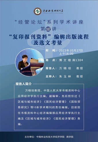 10月27日下午,公司与经济公司联合举办的“经管论坛”系列学术讲座第102讲“‘复印报刊资料’编辑出版流程及选文考量”在博文楼南1304成功举办。本期讲座嘉宾为中国人民大学书报资料中心应用经济学执行主编,副编审万晓琼教授,朱玉林教授出席并主持,百余名师生参加学习。