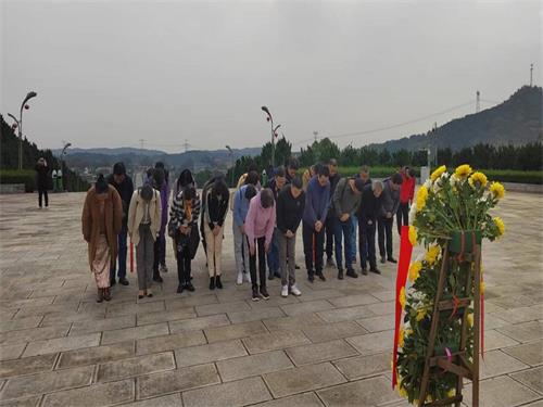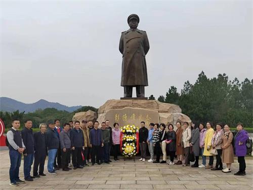 来到彭德怀同志铜像前,党员同志们列队拾级而上,肃立默哀,鞠躬致敬,彭爽书记和方威经理代表同志们向彭德怀同志铜像敬献花篮。