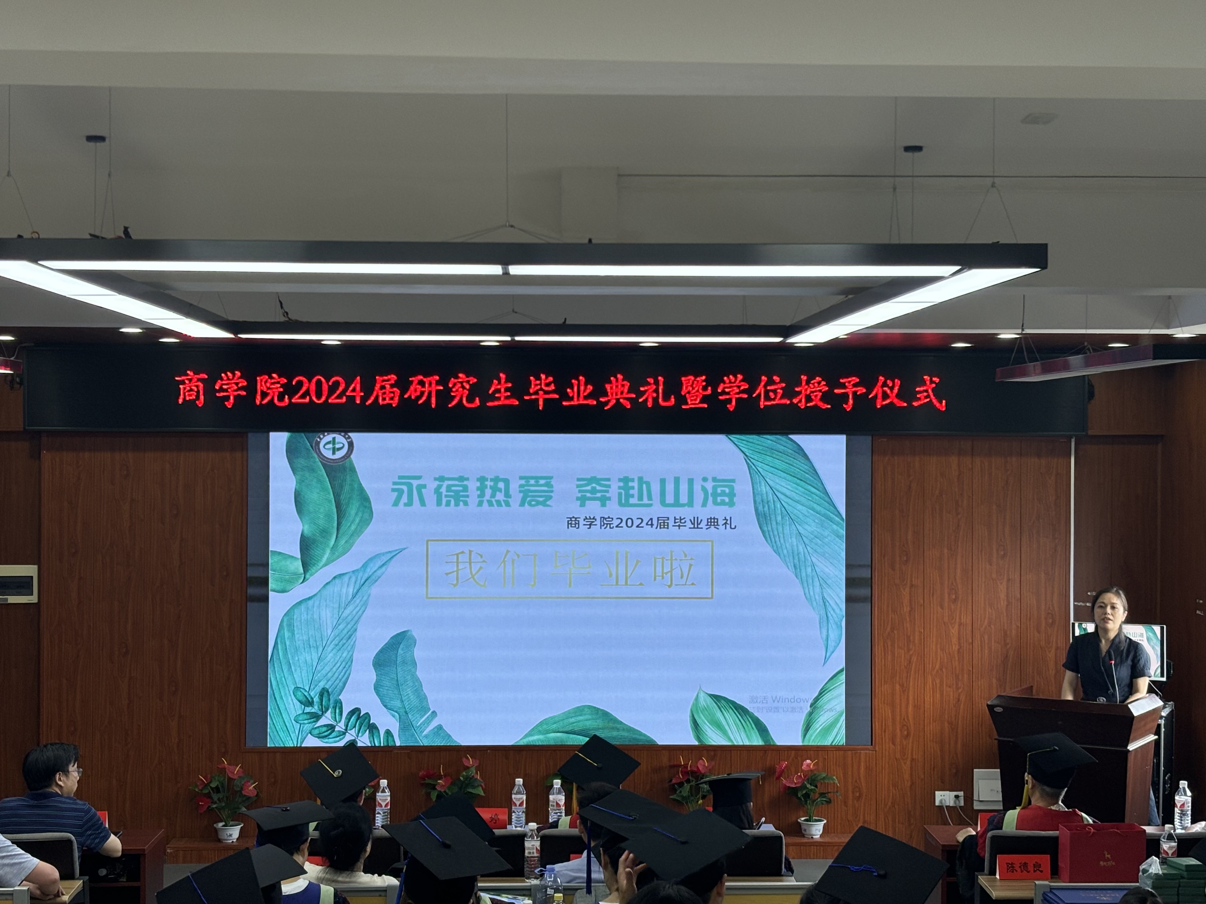 副经理甘瑁琴在宣读授予学位决定及名单后,与尹少华教授、彭秀丽教授、罗攀柱教授一同为毕业生拨穗正冠并颁发证书。
