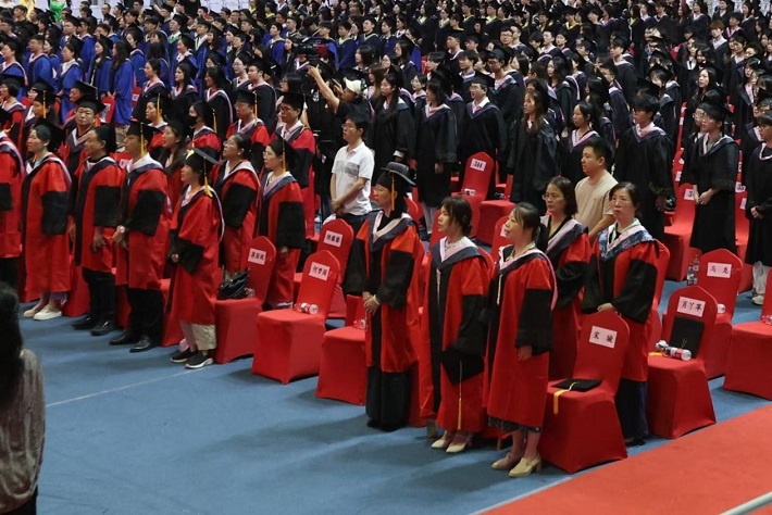 随着拨穗仪式的开始,现场氛围被推向高潮。毕业生们按顺序上台,主席台上的老师们轻握拨穗棒,将学位帽上的流苏从右拨向左。流速轻移间,这一简单却意义非凡的动作,代表着同学们从青涩走向成熟,从校园迈向更广阔的天地。