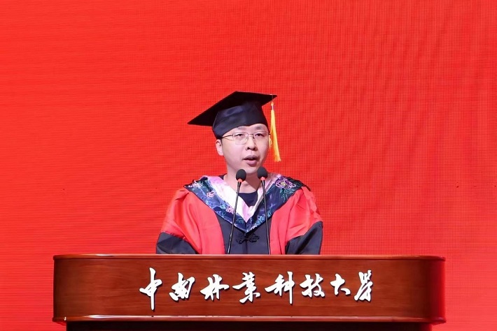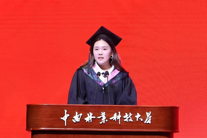 人力资源管理系教师袁宝龙和供应链管理专业毕业生赵璐妍分别作为师生代表上台发言,字里行间都流露出母校、老师和同学们之间难舍的情谊。袁宝龙老师在发言中回顾了与同学们一路走来的宝贵时光,从初入校园的青涩到如今的自信从容,每一个进步的足迹都见证了老师们的悉心教导和同学们的勤奋拼搏。他勉励毕业生们要持续学习,敢于追逐精神自由,敢于直面挫折磨难,将所学知识与实践相结合,为社会的发展贡献自己的智慧和力量。赵璐妍同学则作为毕业生代表,表达了对母校的深深感激和对老师们的由衷谢意,同时也流露出对同窗情谊的依依不舍。她分享了在校期间的成长感悟和学习心得,鼓励同学们在未来的人生旅途中不忘初心,砥砺前行。